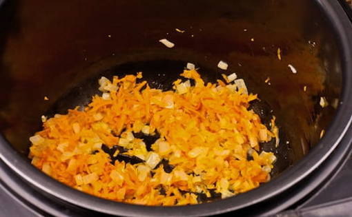 - Schil de wortelen en hak of wrijf (in dit geval is het beter om een fijne rasp te nemen). Voeg het toe aan de ui en bak een paar minuten mee. We wassen en schillen de aardappelen, snijden ze in blokjes en voegen toe aan de groenten, roeren. Aan het einde van de "Fry" -modus zouden de groenten klaar moeten zijn, maar als u "Bakken" kiest, kost het meer tijd.