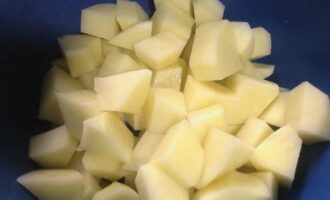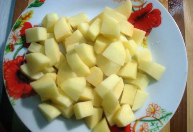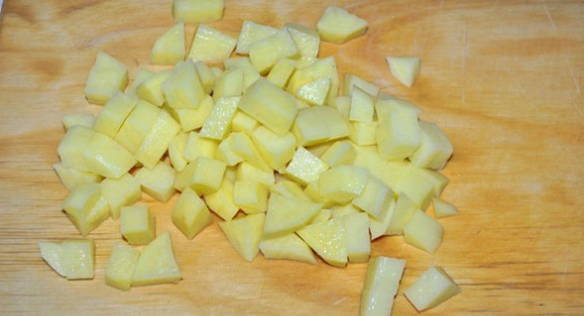 - Giet koud water in een pan en zet in brand. Schil de aardappelen, snijd ze in blokjes en stuur ze naar kokend water.