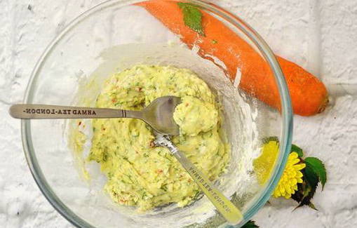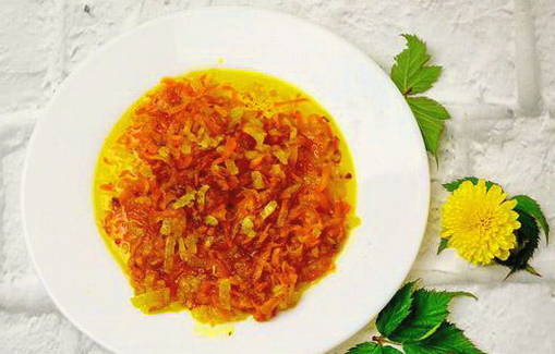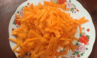 We reinigen en wrijven de wortels op een grove rasp. Verhit plantaardige olie in een koekenpan en bak de wortelen en uien hierin tot ze half gaar zijn.