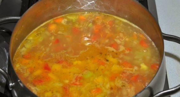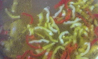 - Snijd de paprika's in blokjes en voeg ze toe aan de bouillon.