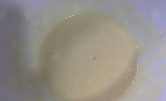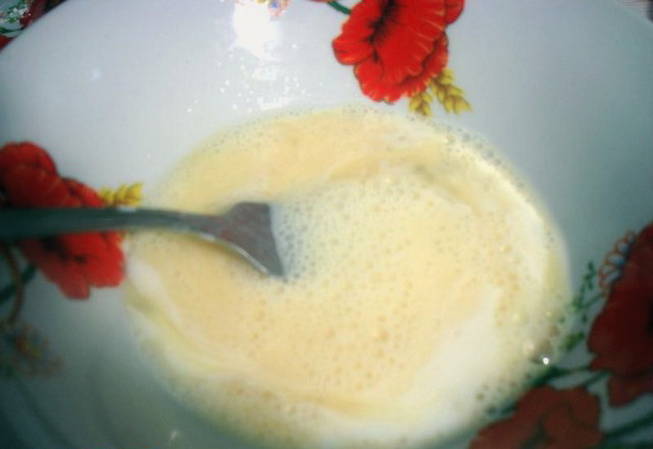 - Laten we beginnen met het koken van dumplings. Giet melk in een geschikte container en breek daar het ei. Schud een beetje en voeg zout toe. Meng grondig.