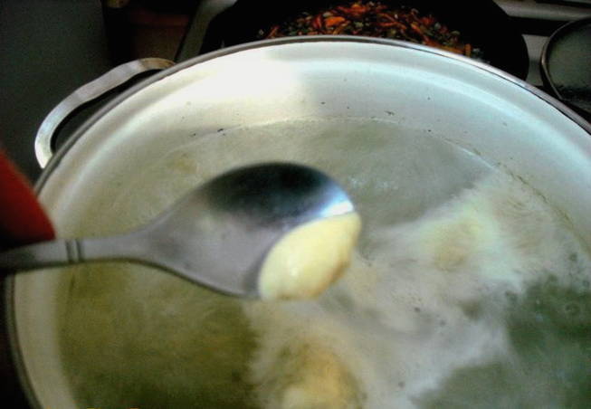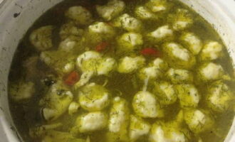 - Vervolgens gooien we er geleidelijk dumplings in. We doen dit in kleine porties, na elk roeren zodat ze niet aan elkaar plakken en niet aan de bodem van de pan plakken. Kook ongeveer 10 minuten.