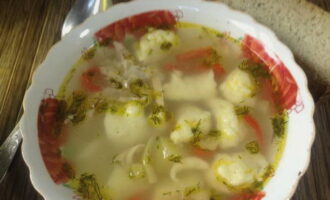 Gebruik een theelepel om het deeg in de soep te verdelen. We verzamelen niet meer dan een halve lepel, omdat de afgewerkte dumplings 2 keer zullen toenemen. We blijven 7 minuten koken. Voeg verse kruiden toe en haal de pan van het vuur.
