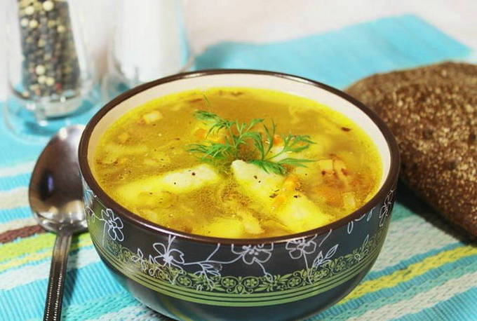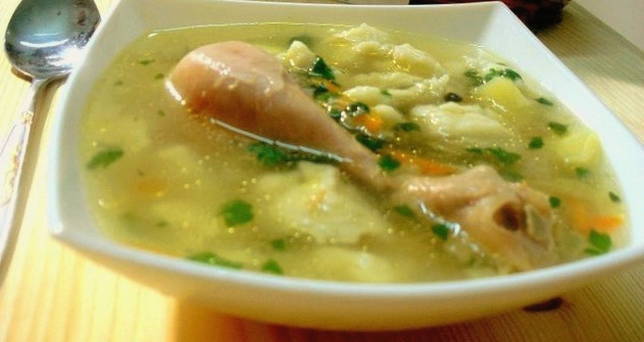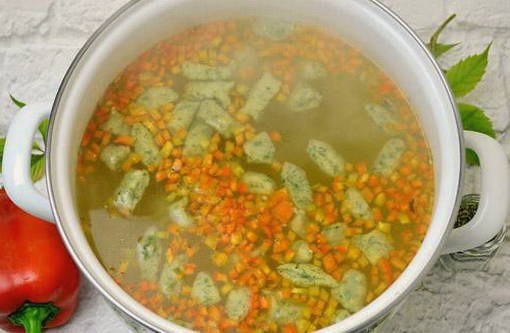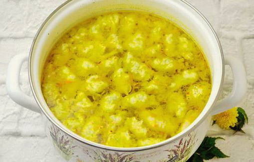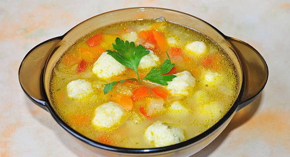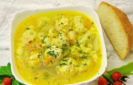 Voor deze soep worden gehaktballetjes van kipfilet bereid. Ze zijn zacht en geurig. Aardappelen worden hier niet gebruikt, omdat ze de smaak van knoedels van eieren, meel, water, plantaardige olie, zout en peper zullen overheersen.