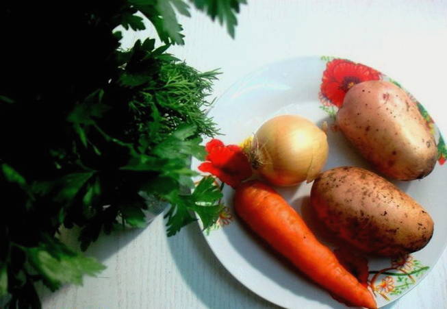 - Was en schil aardappelen, wortelen en uien. Spoel verse peterselie onder koud water.