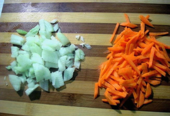 - Pel de ui en hak fijn. Hetzelfde doen we met wortelen.