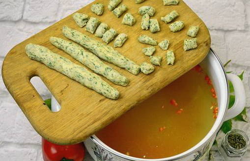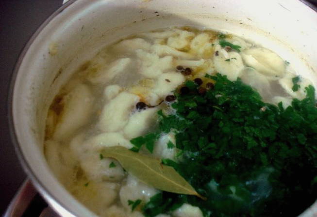 - We sturen ze voorzichtig naar de bouillon.Neem hiervoor een theelepel, verzamel een kleine hoeveelheid deeg en gebruik een andere lepel om het in de bouillon te duwen. Kook de dumplings tot ze omhoog komen.