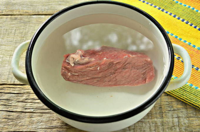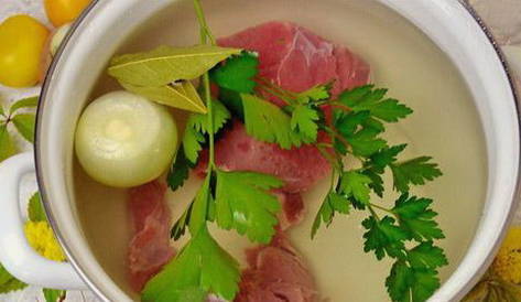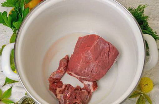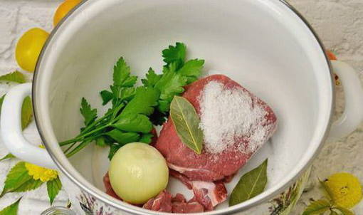 - Spoel het vlees goed af en doe het in een pan. Vul met koud water en steek in brand. Kook tot ze gaar zijn gedurende ongeveer anderhalf uur. Voeg tijdens het proces zout naar smaak toe.