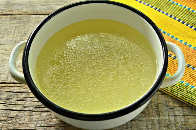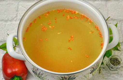 - Voeg wat zout toe aan de bouillon. We zetten een bak naast de pan, waarin we een beetje water gieten.