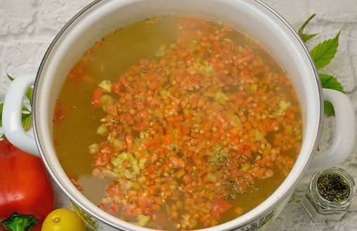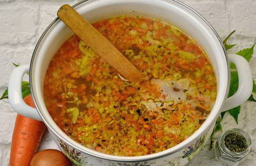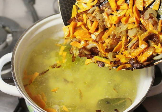 - Gedurende deze tijd bereiden we de frituur voor. Bak fijngehakte wortelen en ui in plantaardige olie tot ze zacht zijn. We sturen groenten naar de soep en mengen.