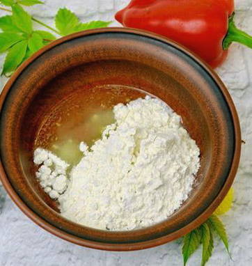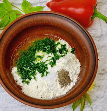 - Voeg plantaardige olie, gezeefde bloem, zoete gedroogde pepers en een beetje verse dille toe.
