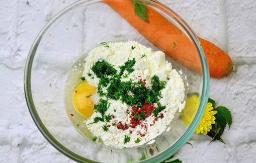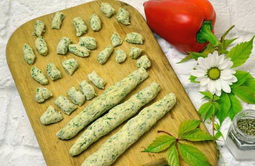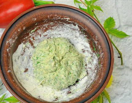 - Voeg geleidelijk gezeefde bloem en verse kruiden toe. Kneed het deeg met je handen. We sturen het 30 minuten naar de koelkast zodat het afkoelt en harder wordt.