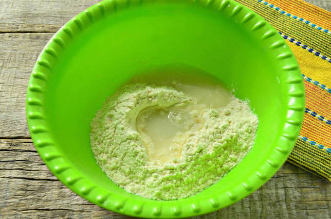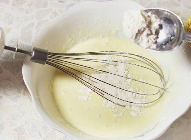 - Voeg nu de bloem toe. Het is beter om het van tevoren te zeven. Mix alles goed met een vork tot een glad beslag. Het deeg moet eruitzien als dikke zure room.