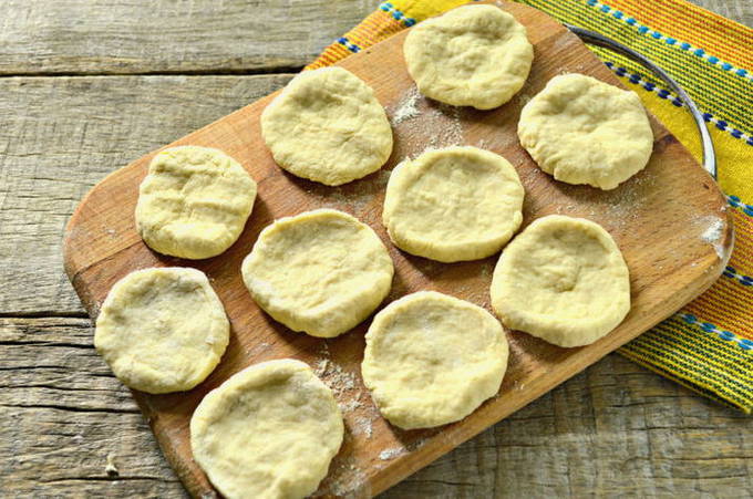 - Snijd het deeg in stukken en maak er worstjes van. Snijd ze in stukjes en vorm ronde cakes.