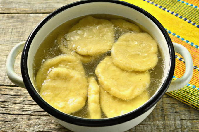 - We sturen de deegcakes naar de kokende bouillon en koken tot ze volledig gaar zijn gedurende 10-15 minuten nadat ze drijven.