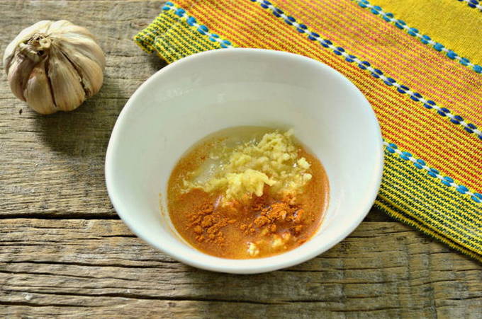 - Laten we beginnen met het bereiden van de knoflookdressing. Haal de knoflook door een pers. Voeg er plantaardige olie en rode peper aan toe. Meng alles goed.