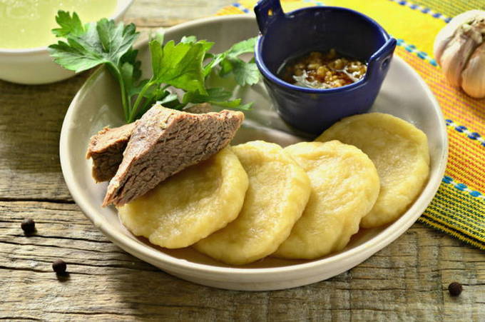 - Om het gerecht goed te serveren, moet je knoedels en een paar stukjes lamsvlees op een bord leggen. We leggen de knoflookdressing ernaast en schenken de bouillon in een apart bord. Versier met kruiden. Eet smakelijk!