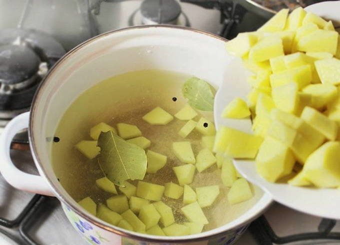 - Giet water in een pan, zet in brand en breng aan de kook. Schil op dit moment de aardappelen en snijd ze in blokjes. Voeg zout toe aan het water en stuur de aardappelen daar samen met laurierblaadjes en zwarte peper. Kook gedurende 15 minuten op laag vuur tot de helft gaar is.