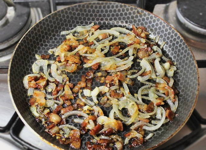 - Snijd het spek in kleine stukjes en bak in een pan zonder olie toe te voegen tot ze goudbruin zijn. Pel de uien en snijd ze in halve ringen. We sturen het naar het spek en bakken tot het doorschijnend is.