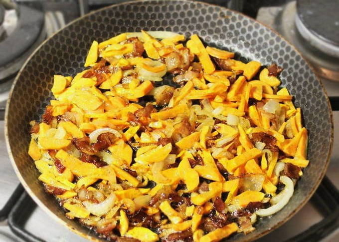 - Schil de wortel, snij in reepjes en voeg toe aan de ui en het spek. We blijven frituren tot het goudbruin is. Haal de pan van het vuur.