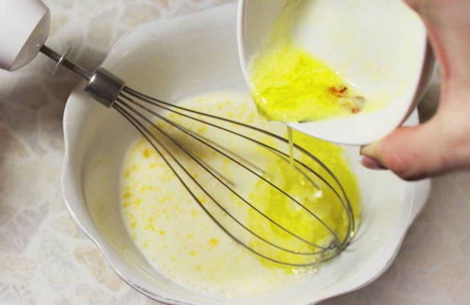 - Laten we beginnen met het maken van deeg voor dumplings. Meng hiervoor de melk met het ei in een apart bakje. Voeg zout en gesmolten boter toe. Klop alles goed los met een vork. Indien gewenst kunt u geraspte harde kaas en verse kruiden aan het deeg toevoegen.