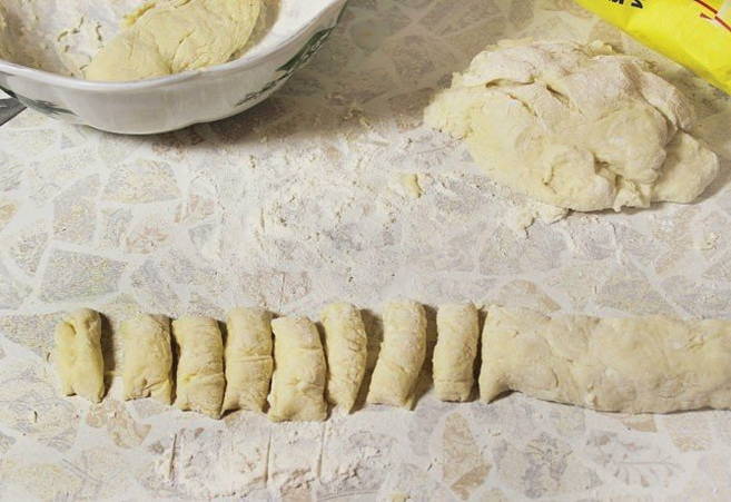 - Verdeel het knoedeldeeg in gelijke delen en rol er worstjes van. Je zou ongeveer 4-5 stuks moeten krijgen. We snijden ze in nette rechthoeken.