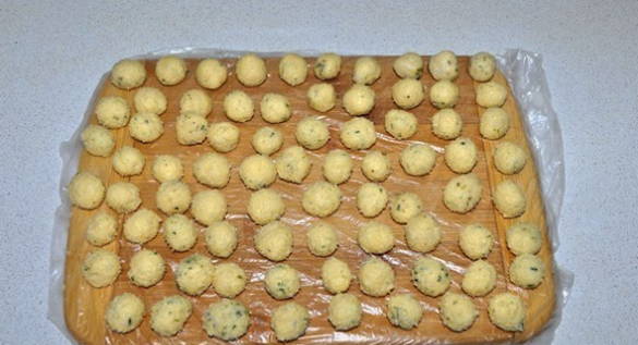 - Voordat je de soep gaat koken, haal je het deeg uit de koelkast en begin je met het boetseren van kleine balletjes. Ze moeten ongeveer 15-20 mm in diameter zijn. We bedekken ze met folie en sturen ze terug naar de koelkast.