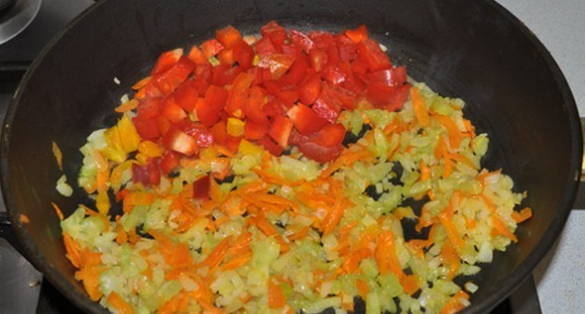 - Nu zijn we de frituur aan het voorbereiden. Snijd hiervoor de ui en bleekselderij fijn. Wrijf de wortelen op een grove rasp. Verhit plantaardige olie in een koekenpan en bak hierin groenten enkele minuten. Snijd vervolgens de paprika's fijn en stuur ze naar de pan. We laten alles ongeveer 5 minuten sudderen.