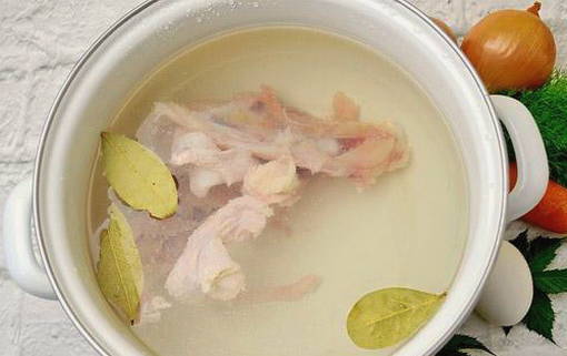 - Snijd eerst de filet van de kipfilet. We sturen het bot samen met de schil in een pan en vullen deze met koud water. Zout en voeg het laurierblad toe. We sturen naar het vuur.