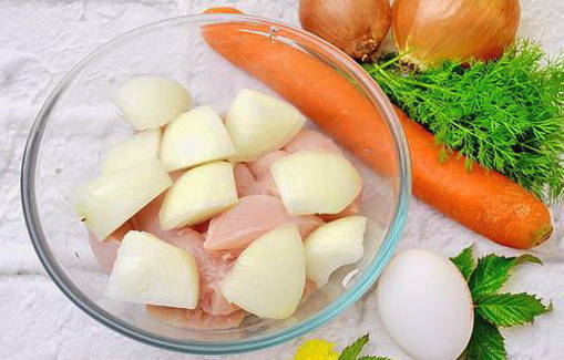 - Snijd de filet in stukken en doe in een geschikte bak. Een ui, schil en snijd in grote stukken. We sturen het naar de kip.