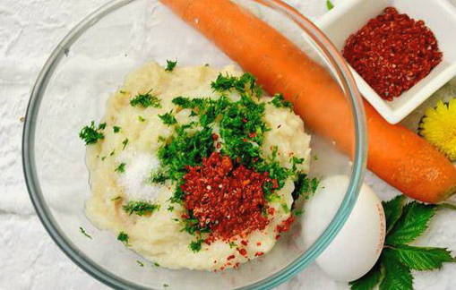- Voeg een beetje zout, paprika en verse kruiden toe aan het gehakt. Mix alles goed tot een glad geheel.
