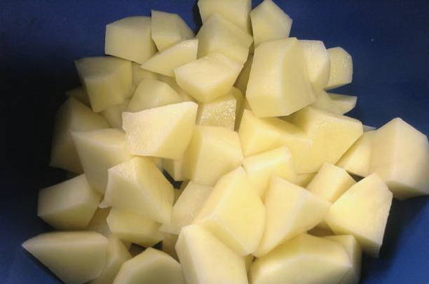 - Giet koud water in een pan en zet in brand. Schil de aardappelen, snijd ze in blokjes en stuur ze naar kokend water.
