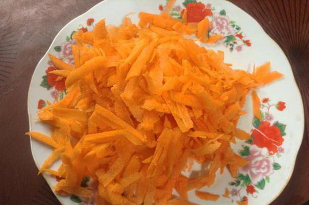 We reinigen en wrijven de wortels op een grove rasp. Verhit plantaardige olie in een koekenpan en bak de wortelen en uien hierin tot ze half gaar zijn.