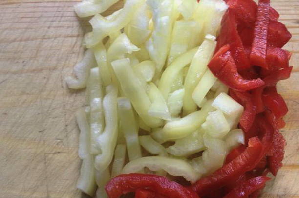 Mijn paprika, verwijder de zaadjes en snij in reepjes.