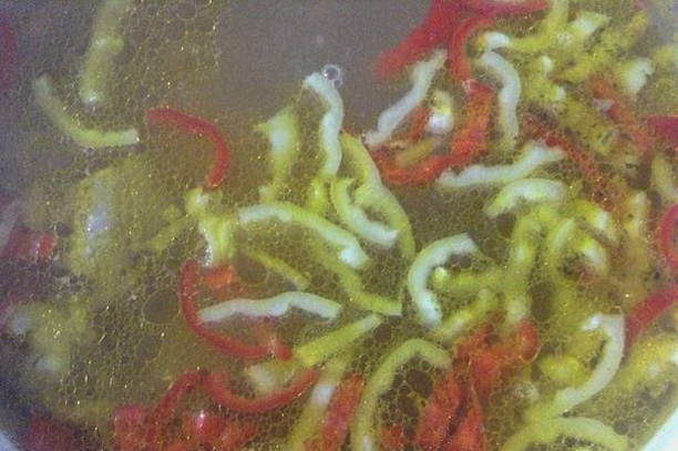 - Snijd de paprika's in blokjes en voeg ze toe aan de bouillon.