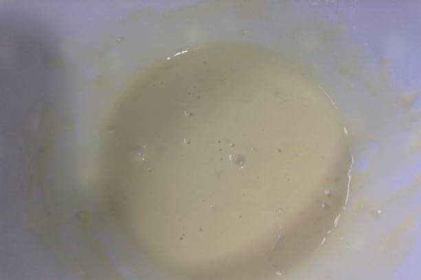 - Laten we beginnen met het koken van dumplings. Giet melk in een geschikte container en breek daar het ei. Schud een beetje en voeg zout toe. Meng grondig.