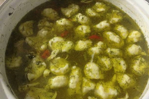 - We sturen ze voorzichtig naar de bouillon.Neem hiervoor een theelepel, verzamel een kleine hoeveelheid deeg en gebruik een andere lepel om het in de bouillon te duwen. Kook de dumplings tot ze omhoog komen.