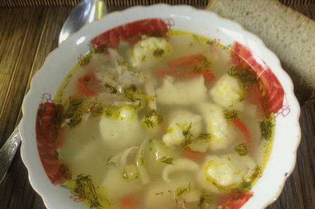 Voor deze soep worden gehaktballetjes van kipfilet bereid. Ze zijn zacht en geurig. Aardappelen worden hier niet gebruikt, omdat ze de smaak van knoedels van eieren, meel, water, plantaardige olie, zout en peper zullen overheersen.