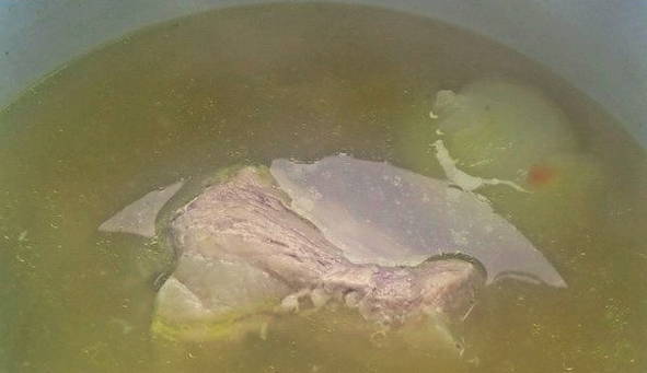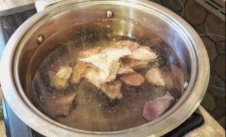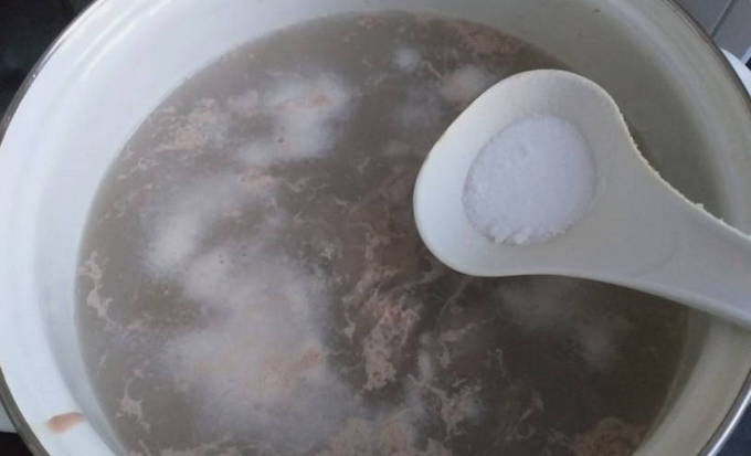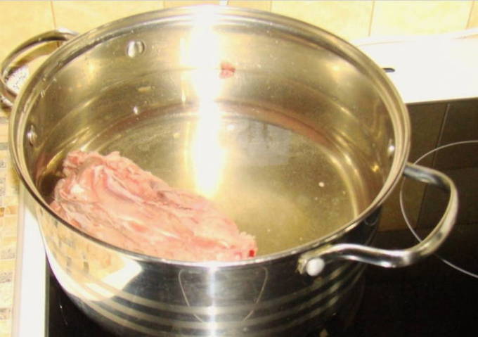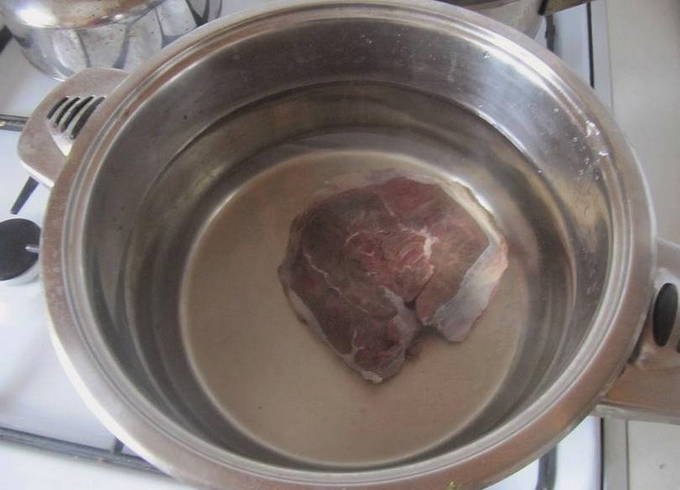 - Was het vlees en stuur het in zijn geheel in een pan met verwarmd water. Breng aan de kook en voeg een beetje zout toe. Zorg ervoor dat u het schuim van het oppervlak verwijdert. Daarna koken we het vlees 30 minuten.