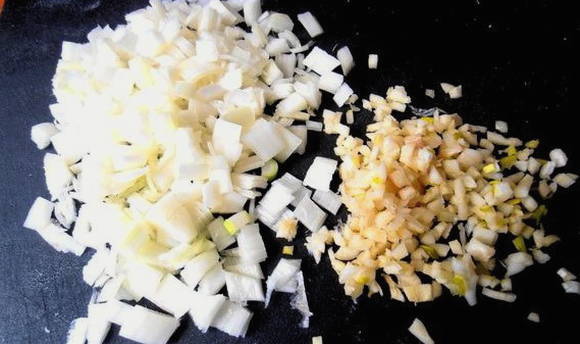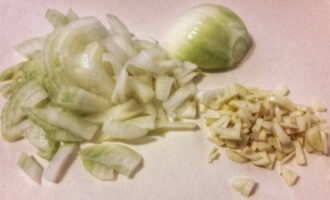 Op dit moment beginnen we met het bereiden van groenten. Hak de gepelde ui fijn met knoflook.