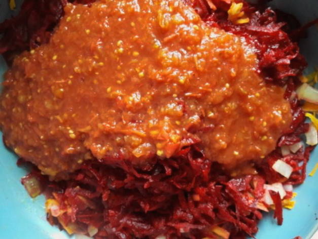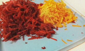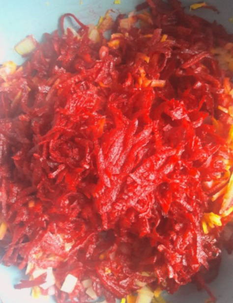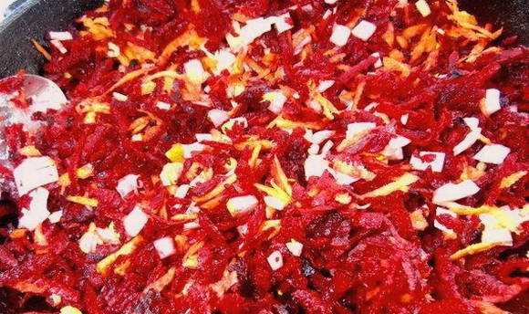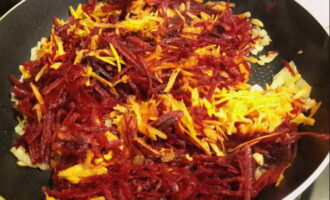 - We sturen de wortels geraspt op een grove rasp in een koekenpan met uien en bak ze drie minuten, voeg dan de bieten toe en bak nog eens 10 minuten, af en toe roeren.