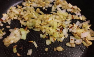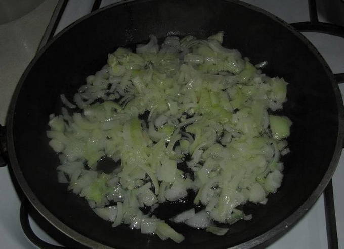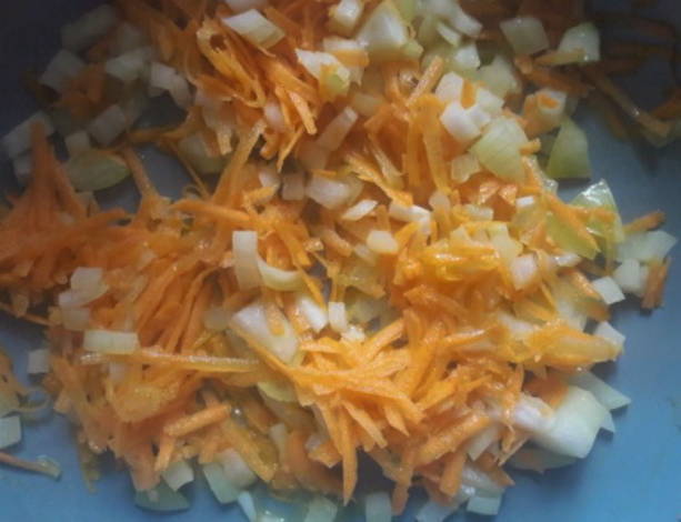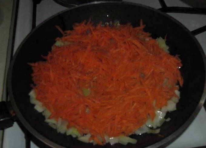 - Laten we nu naar het hoofdpodium gaan. We wassen alle benodigde groenten en verwijderen de schil. We malen het op een voor u geschikte manier en sturen het naar een koekenpan die is voorverwarmd met plantaardige olie. Bak tot ze goudbruin zijn, af en toe roeren.