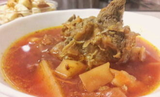 - Snijd de aardappelen in kleine blokjes, gepelde tomaten en stuur ze naar de bouillon, voeg een handvol granen toe. Haal het vlees uit de soep en snij in kleinere stukken. We halen de ui er ook uit, die hebben we niet meer nodig.