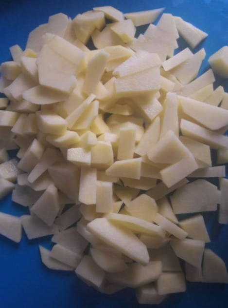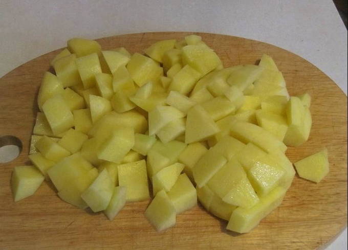 - Snijd de aardappelen op een willekeurige manier en stuur ze naar de bouillon.