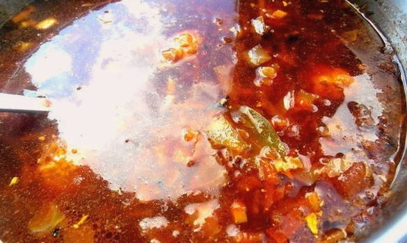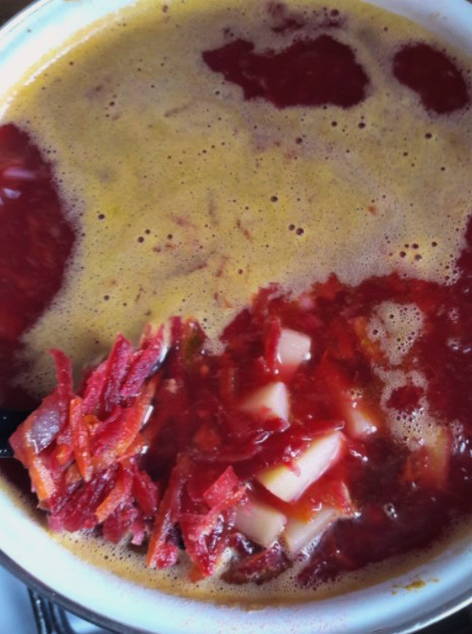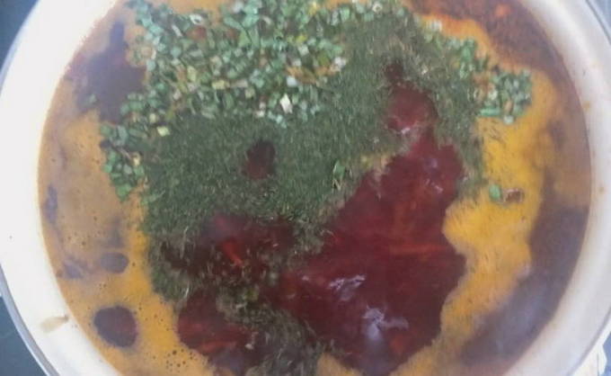 - Laten we verder gaan met het bouwen van de soep. Doe de hele braadpan met gehakte kruiden in een pan met kant-en-klaar rundvlees. We laten de rode biet infuseren. Hoe meer tijd het kost, hoe lekkerder en aromatischer de rode biet zal worden.
