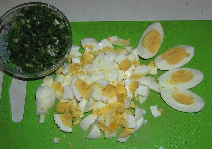 - Maak de afgekoelde eieren schoon en snijd ze in plakjes. Hak ook de greens zo klein mogelijk.