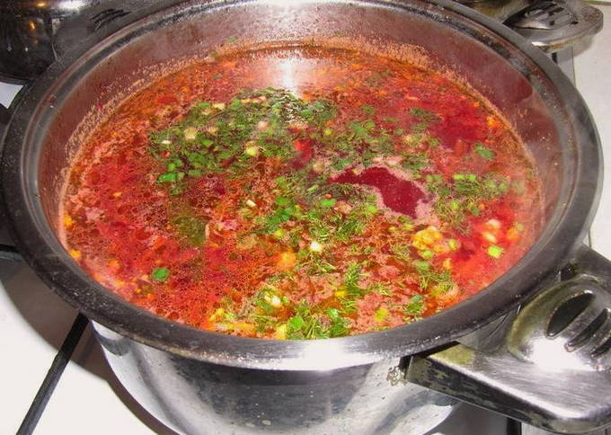 - We laten de borsjt nog 10 minuten koken en hebben geduld, zodat de borsjt de tijd heeft om te trekken en een heldere uniforme kleur te krijgen. Serveer in porties. Breng indien gewenst de rode biet op smaak met zure room en verse kruiden.
