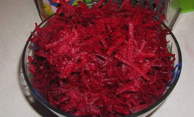 - Wrijf de geschilde bieten op een grove rasp en voeg dan een beetje azijn toe, dit helpt om de rijke kleur van de bieten te behouden.