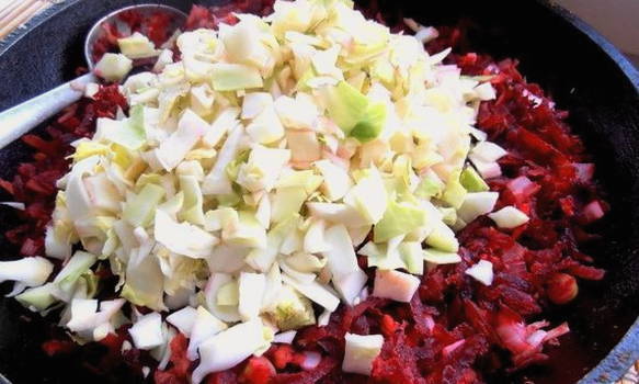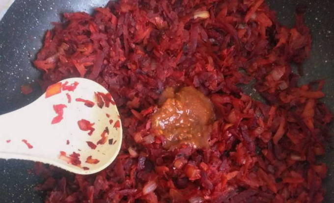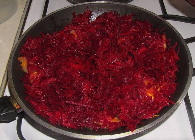 Als de ui bruin wordt, voeg je de geraspte wortel en bieten toe. De bereidheid wordt bepaald door de zachtheid van groenten. Ze nemen ook in volume af.