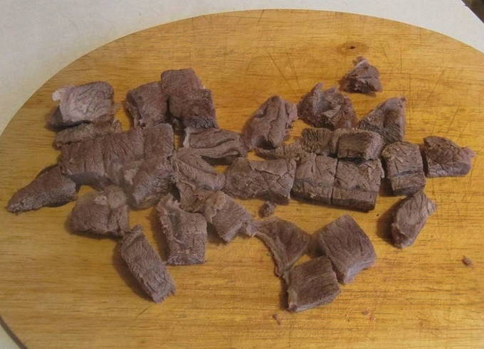 - Haal het gekookte rundvlees uit de pan, snijd het in kleine stukjes en doe het terug in de afgewerkte bouillon. In dit stadium kan de bouillon worden gezouten en kan een beetje peper worden toegevoegd.